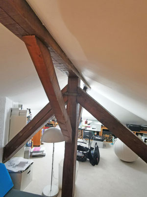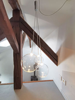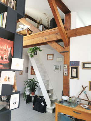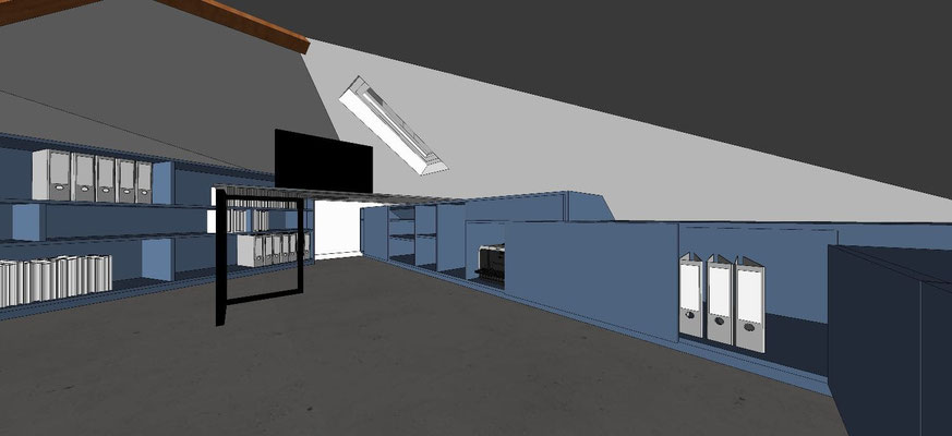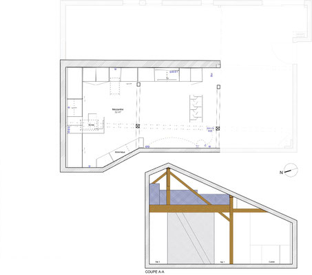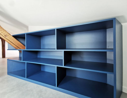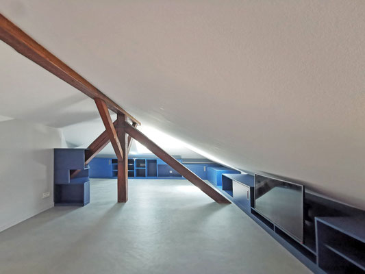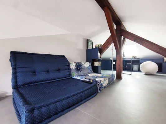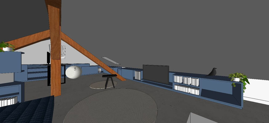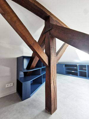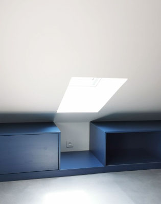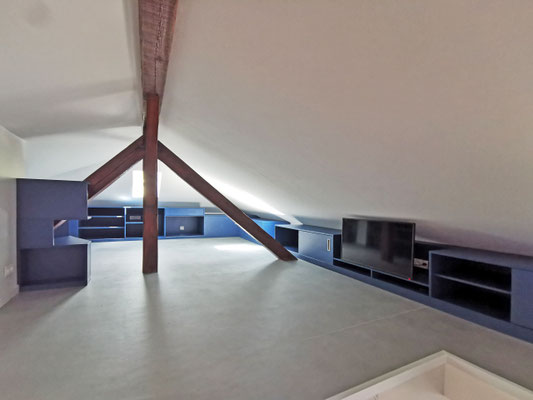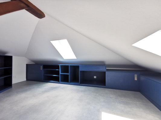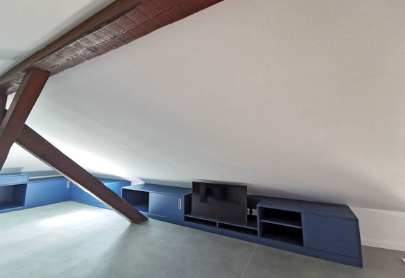 En mezzanine, le besoin des clients en terme de fonctionnalité était de disposer d'un coin salon pour la détente et d'un bureau pour le télétravail, avec suffisamment de rangements pour ces deux activités. Nous avons créé un meuble filant sur mesure en sous-pente, véritable couteau suisse qui regroupe les fonctions rangement, bureau, et meuble TV et qui peut aussi servir de présentoir pour les objets décoratifs ou les collections ... Une bibliothèque a également été créée dans le même style. Les réseaux électriques et réseaux éthernet ont été créés, le sol a été remplacé et les murs ont été rénovés et repeints.