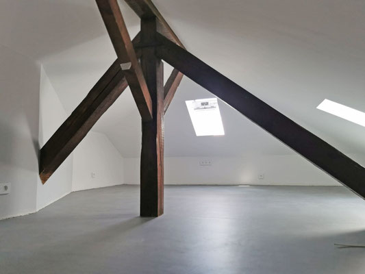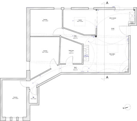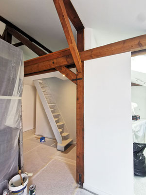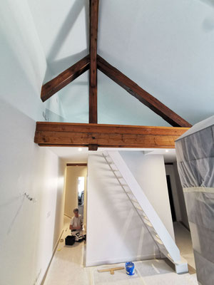 Au niveau du rez-de-chaussée, les murs ont été repris totalement (ponçage de l'enduit projeté existant, enduisage et peinture). L'électricité a été revue et de petits travaux de menuiseries intérieure ont été effectués.